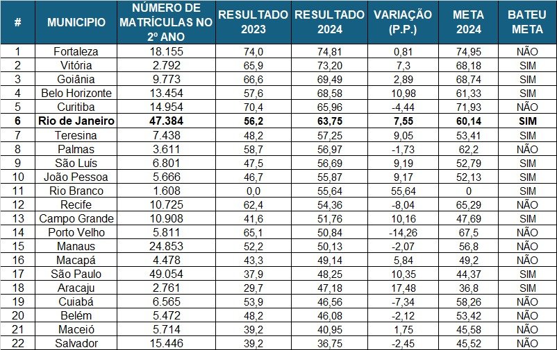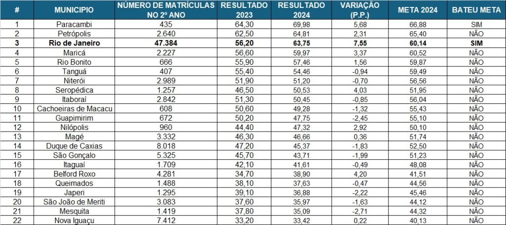 A cidade do Rio teve o maior crescimento entre os municípios da região metropolitana do Estado do Rio de Janeiro. Está em 3° lugar, mesmo tendo 100 vezes mais alunos no 2º ano do ensino fundamental que o 1º colocado, Paracambi, e 18 vezes que o 2º lugar, Petrópolis. O estado do Rio, como um todo, cresceu, mas não atingiu a meta.