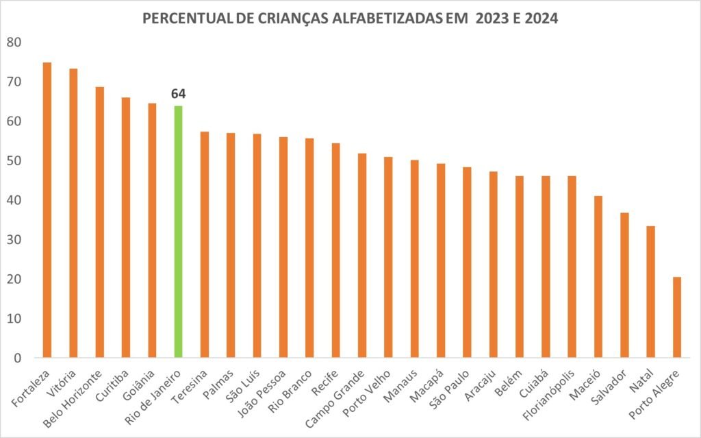 O Ministério da Educação divulgou nesta sexta-feira, 11 de julho, o resultado da avaliação de alfabetização de 2024 para o Brasil, estados e municípios. O Rio de Janeiro teve um dos maiores crescimentos e é uma das seis únicas capitais que superou a meta nacional de 60%. O Rio cresceu de 56% de crianças alfabetizadas na idade certa para 64% em apenas um ano, subiu três posições no ranking das capitais e, hoje, é a 6ª capital com melhor resultado. E a título de comparação, o Rio de Janeiro tem mais alunos que as cinco capitais na frente somadas.