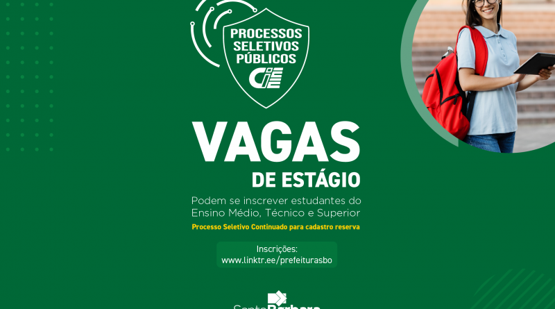 A Prefeitura de Santa Bárbara d’Oeste abriu processo seletivo continuado para cadastro reserva de estagiários, conforme o edital nº 1 de 2026, em parceria com o CIEE (Centro de Integração Empresa-Escola). As inscrições seguem até o dia 15 de fevereiro de 2026 e devem ser realizadas no site do CIEE, por meio do link linktr.ee/prefeiturasbo