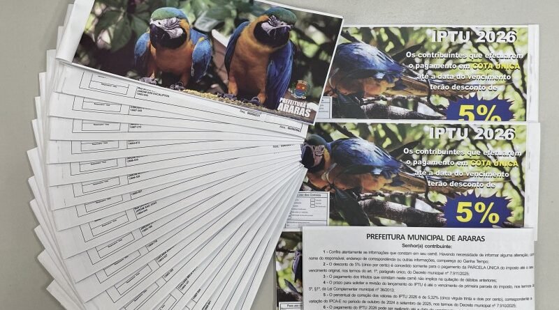 Os boletos do IPTU 2026 já estão disponíveis para pagamento online. Basta acessar https://araras.sp.gov.br/iptu_segunda_via, clicar no ícone da segunda via do IPTU e informar o CPF ou CNPJ do titular do imóvel. Quem tem a opção Débito Direto Autorizado (DDA), ativada nos aplicativos bancários, também já pode fazer o pagamento.