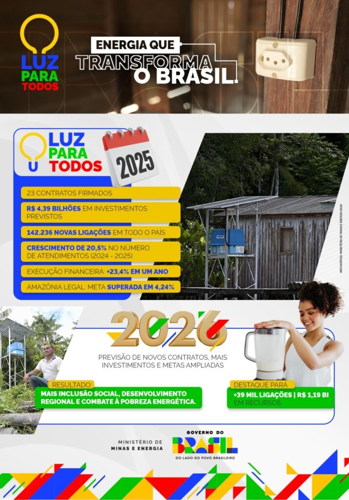 O programa Luz para Todos (LPT) segue transformando a realidade de milhares de famílias brasileiras, promovendo a inclusão social, o desenvolvimento regional e combatendo a pobreza energética. Quando a eletricidade chega a uma residência, ela traz mais dignidade e oportunidades e é com esse propósito que, em 2026, o programa inicie um novo ciclo. Por meio de novos contratos, mais investimentos e metas ampliadas, o Luz Para Todos seguirá permitindo o acesso à energia elétrica em diversas regiões remotas e rurais do Brasil.