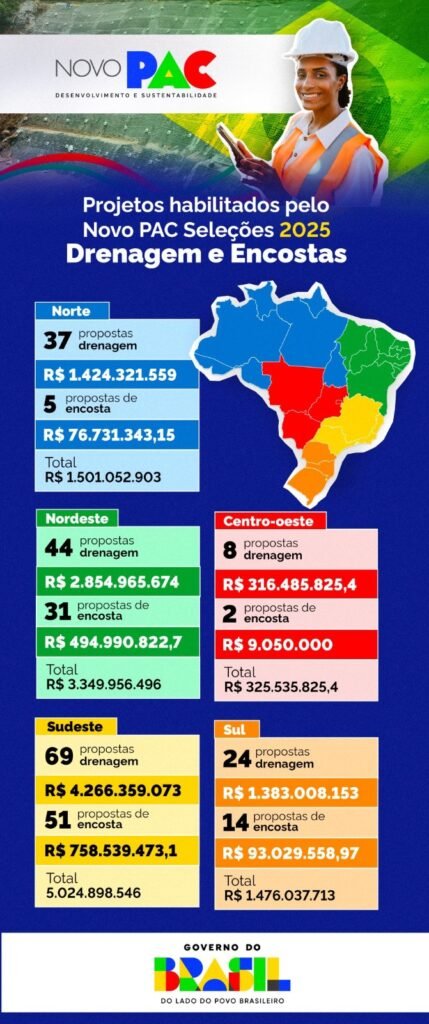 A partir deste resultado, o Novo PAC está investindo mais de R$ 25,8 bilhões em mais de 600 obras de drenagem e contenções de encostas selecionadas nas etapas de 2023-24 e de 2025. EIXOS — A edição 2025 do Novo PAC Seleções prevê investimentos de R$ 49,2 bilhões em quatro eixos: Saúde; Educação, Ciência e Tecnologia; Infraestrutura Social e Inclusiva; e Cidades Sustentáveis e Resilientes. No geral, o governo recebeu 35.119 propostas, enviadas por 5.537 municípios – o que representa 99,4% dos municípios brasileiros.