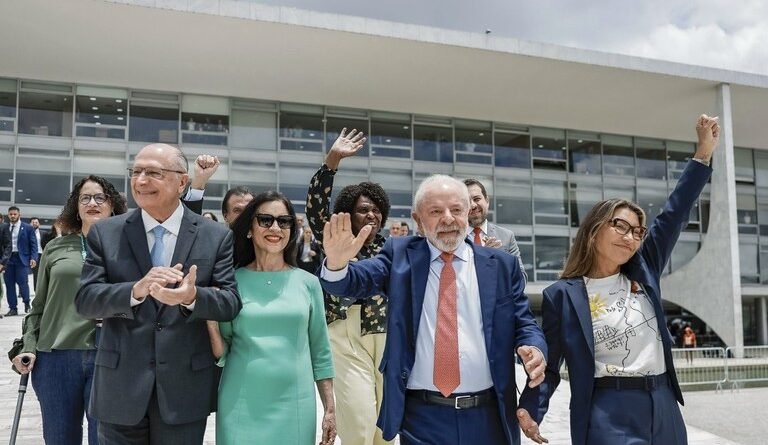 UNIÃO — Encerrado a solenidade, o presidente Lula percorreu a rampa do Palácio do Planalto ao lado de ministros e de representantes dos Três Poderes, em direção ao espaço externo onde estava o público. No local, as autoridades se reuniram junto a uma estrutura simbólica formada por centenas de vasos de flores que desenham a palavra “democracia”.