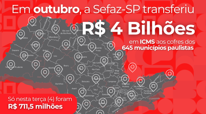 Secretaria da Fazenda repassou mais de R$ 4,3 bilhões em ICMS aos municípios paulistas em outubro